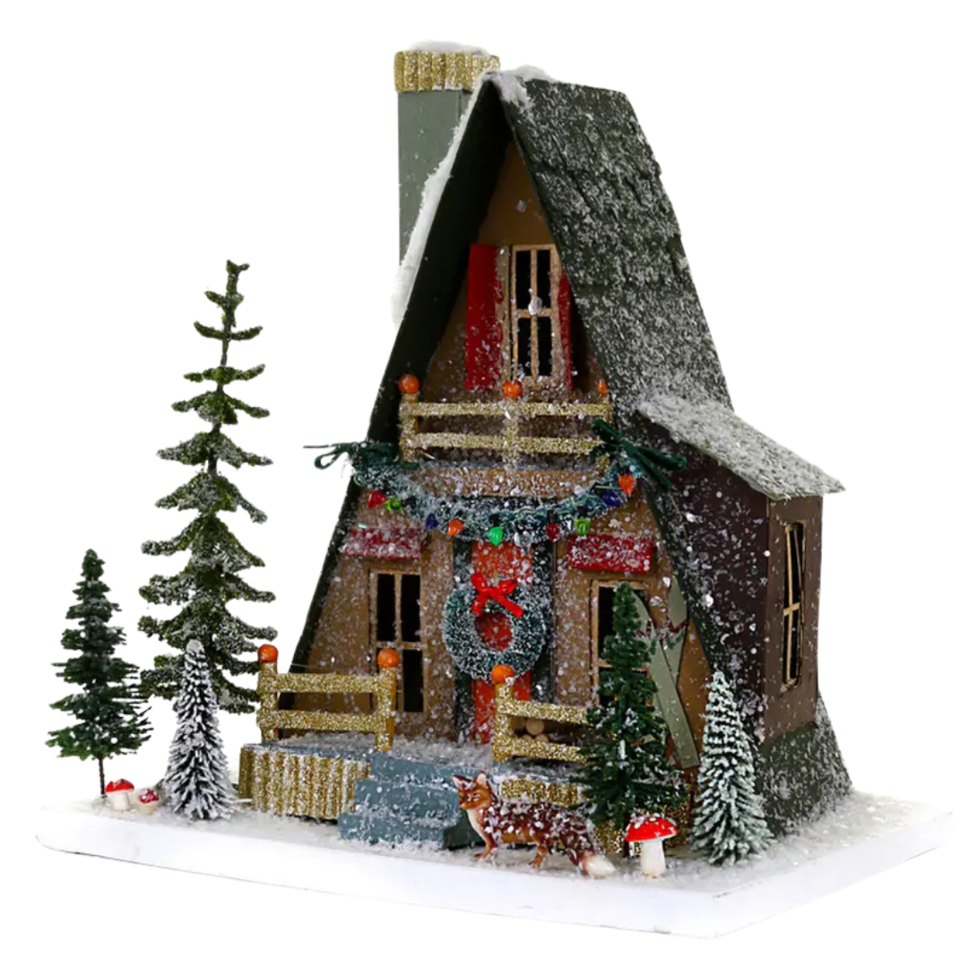 Capture the magic of a woodland holiday retreat with this charming A-Frame Cabin. Tucked in a snowy forest and trimmed with festive garlands and glittering wreaths, this whimsical cabin brings warmth and wonder to any Christmas village scene.
