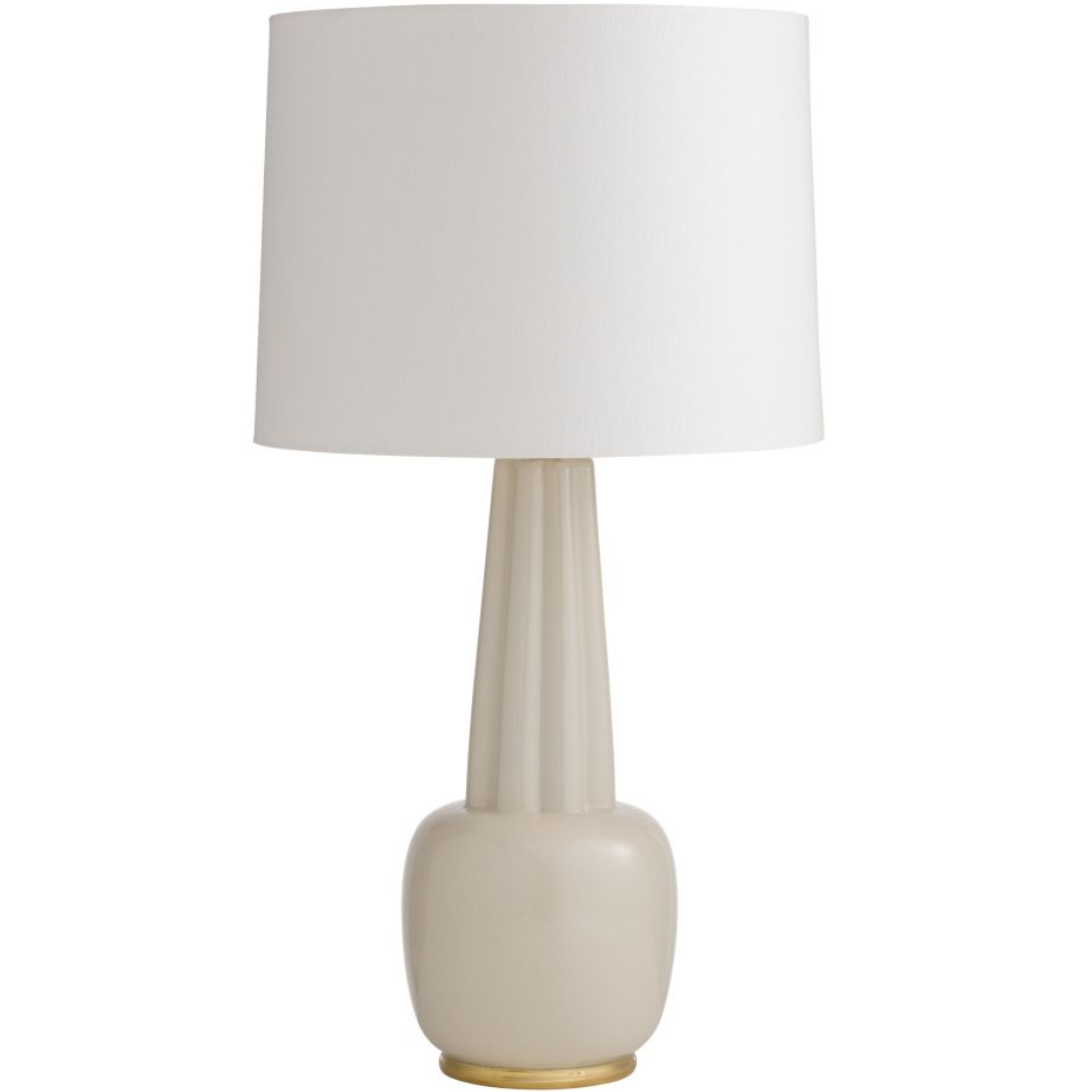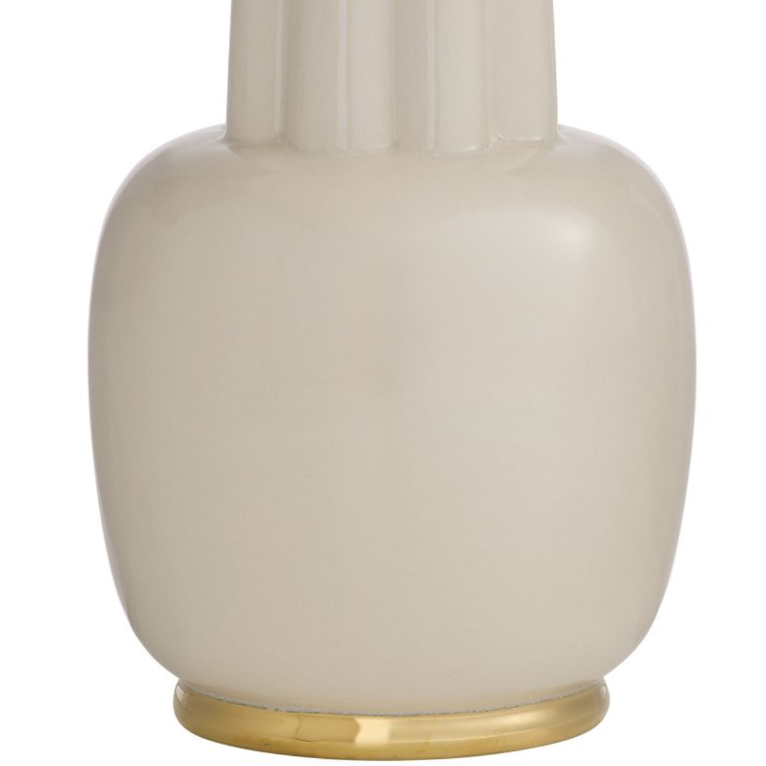 A new finish for a traditional favorite. The porcelain Arlington features an elongated ribbed neck that towers over a rounded base. The ivory finish accentuates its feminine frame. Topped with an off-white linen drum shade lined in off-white cotton and matching porcelain finial. Finish will vary.
