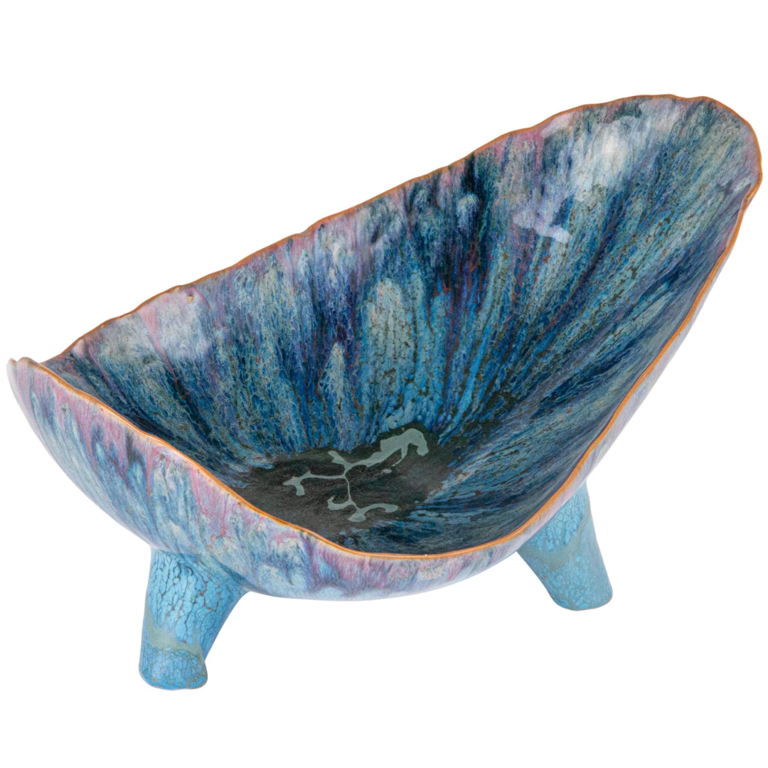 This Azure Coast Footed Bowl is a blend of natural form and mesmerizing color. The reactive glaze creates a dynamic blue pattern, with each bowl offering a distinct look that varies from piece to piece. The 12.50 inches in length, 8.50 inches in width, and 6.00 inches in height make it a versatile choice for both serving and showcasing, while the food-safe material ensures it's ready for any occasion. Whether filled with fresh produce or left empty to admire its beauty, this bowl stands out with its elevated design and captivating hue, making it a cherished addition to any home. Its organic shape and footed base combine to create a piece that's as much a conversation starter as it is a functional item.