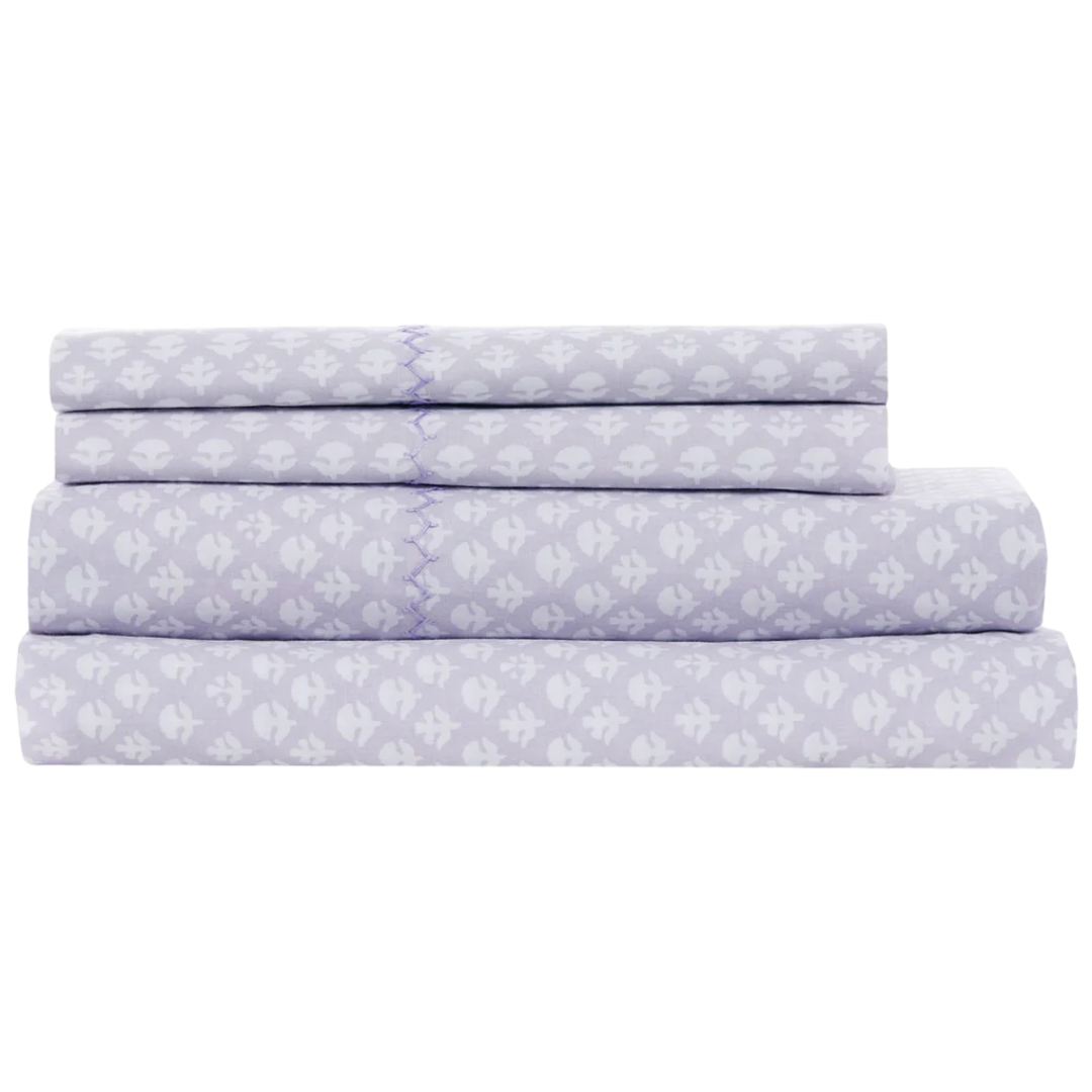 Our favorite dainty floral block print! Organic pre-washed percale is incredibly soft. 200 thread count. Flat sheets and pillowcases are hand stitched in lavender.