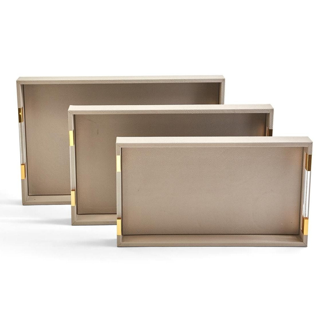 These elegant long faux stingray trays are accented with eye-catching stainless steel and acrylic accents. The trays create the perfect organizing element for corralling toiletries and cosmetics, transporting cocktails or grounding a chic tabletop vignette.