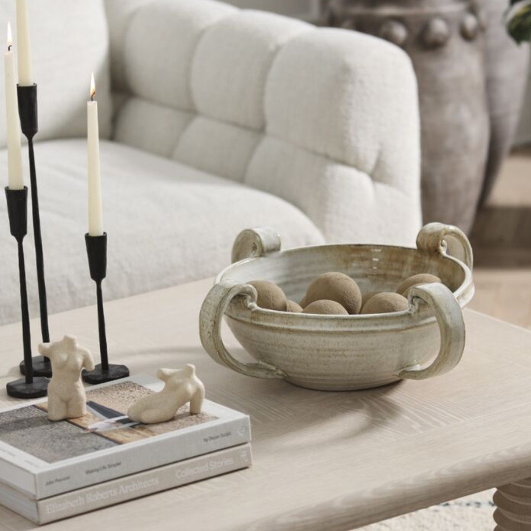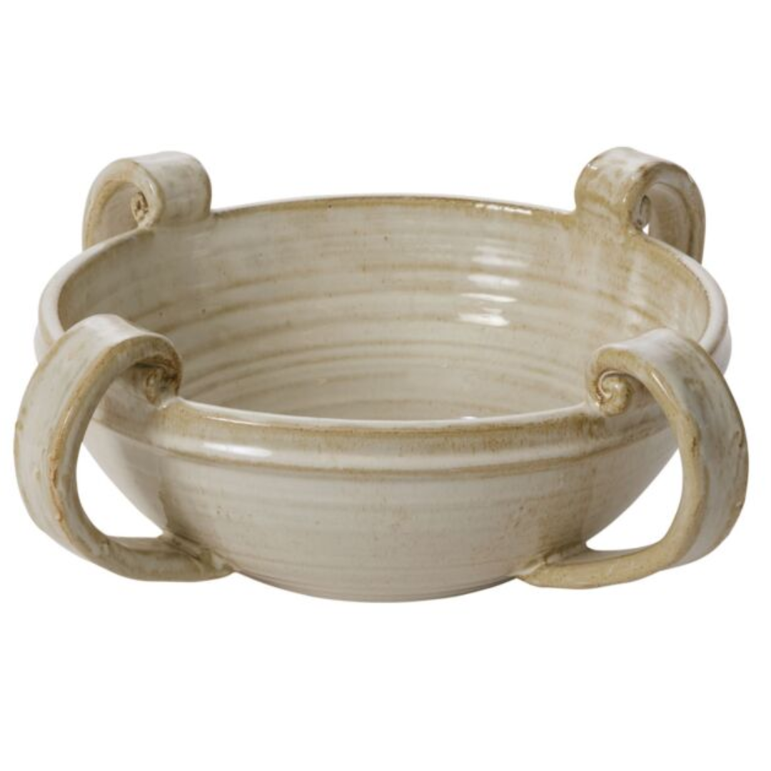 With a sculptural silhouette & warm cream hue, the statement Dolorosa Bowl is both artful home decor & functional bowl for kitchen or dining spaces. Featuring a glossy reactive cream glaze that offers surface variation & four curvy decorative handles, this vessel is beautiful as a catchall for household objects or as a bowl for displaying fruit.