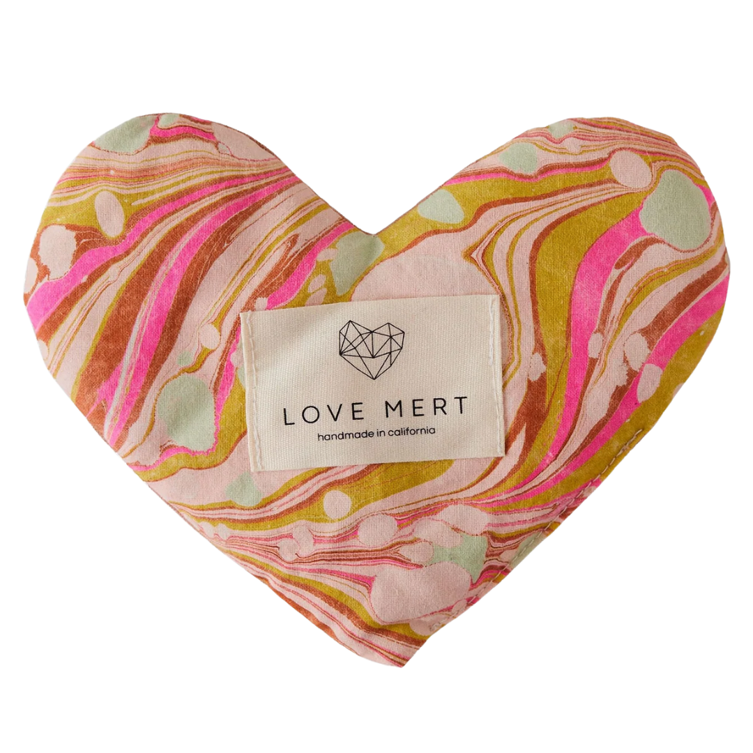 This eye love pillow in a heart shape hugs your face perfectly. Hand marbled mill end cotton with a raw silk backing. Filled with organic flaxseed and lavender. You can heat for 30 seconds in a microwave for comfort or chill in the freezer for a lovely cooling effect.