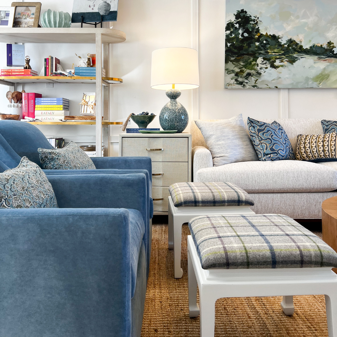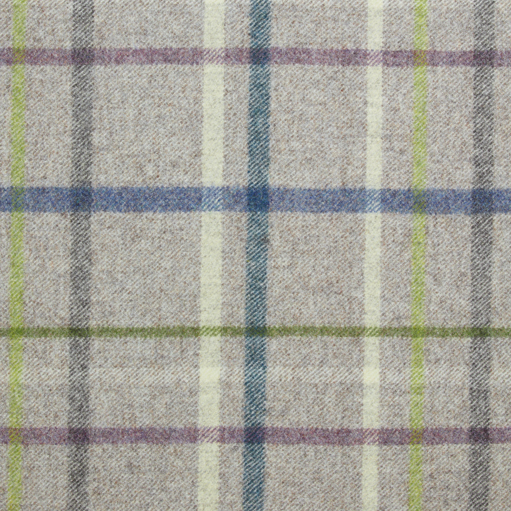 Comfortable Seat – Softly padded with a tailored plaid upholstery in natural tones with hints of green, grey, and blue.
