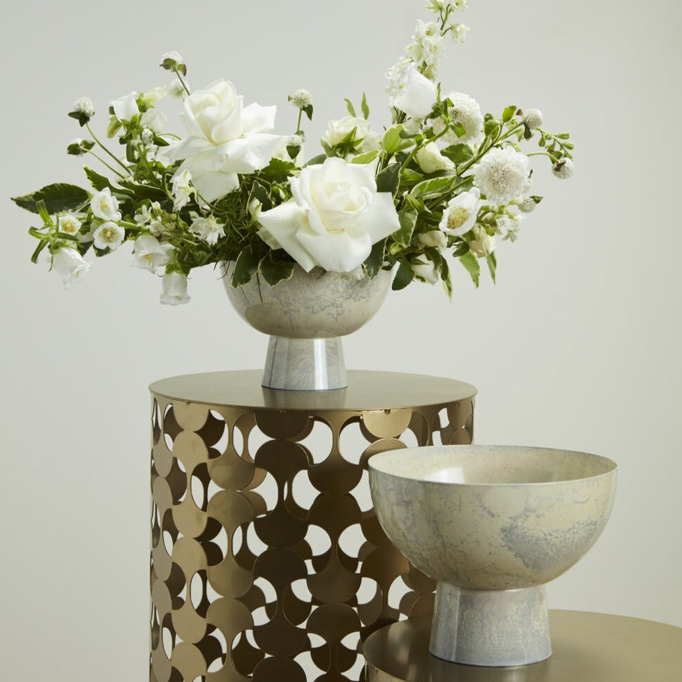 With sleek sophistication & a marbleized opal finish, the large, durable yet lightweight metal Isabella Compote offers a modern simplicity & old world sensibility to wedding & event centerpieces. Its clean bowl shape & soft finish adapts to any design & elevates all floral styles & colors without stealing the show.