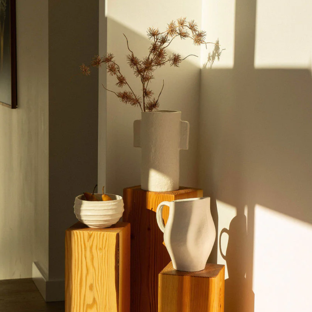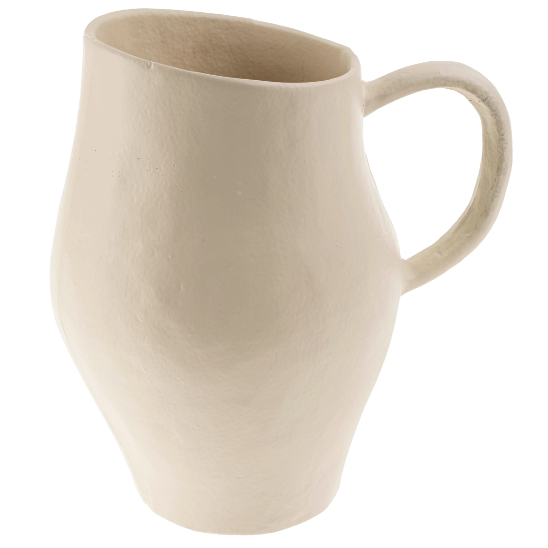 Elemental in design, the Kairos Pitcher is a modern take on a classic silhouette. Handmade in Moradabad, a city in India celebrated for its metal craftsmanship, it is hand cast in aluminum with an ivory powder coat finish. Designed for decorative use only, it is watertight, and makes a beautiful vessel for showcasing your real or faux blooms.