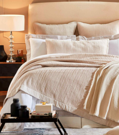 Our breezy Cotton voile bedding is quilted with lean rows of detailed channel stitching. The quilt has an exceptional soft feel which is enhanced by the Natural texture of the fabric.