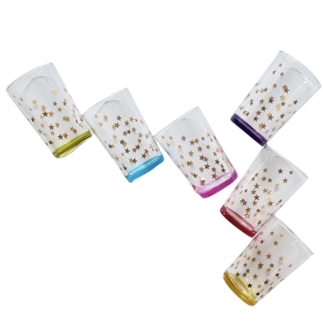 Crafted from clear, high-quality glass, each glass features a charming hand-painted gold heart, symbolizing love and hospitality. The delicate gold design is paired with a colorful bottom, bringing a delightful burst of color to each piece. Perfect for enjoying traditional Moroccan tea or any of your favorite beverages, these glasses offer a unique blend of art and functionality.