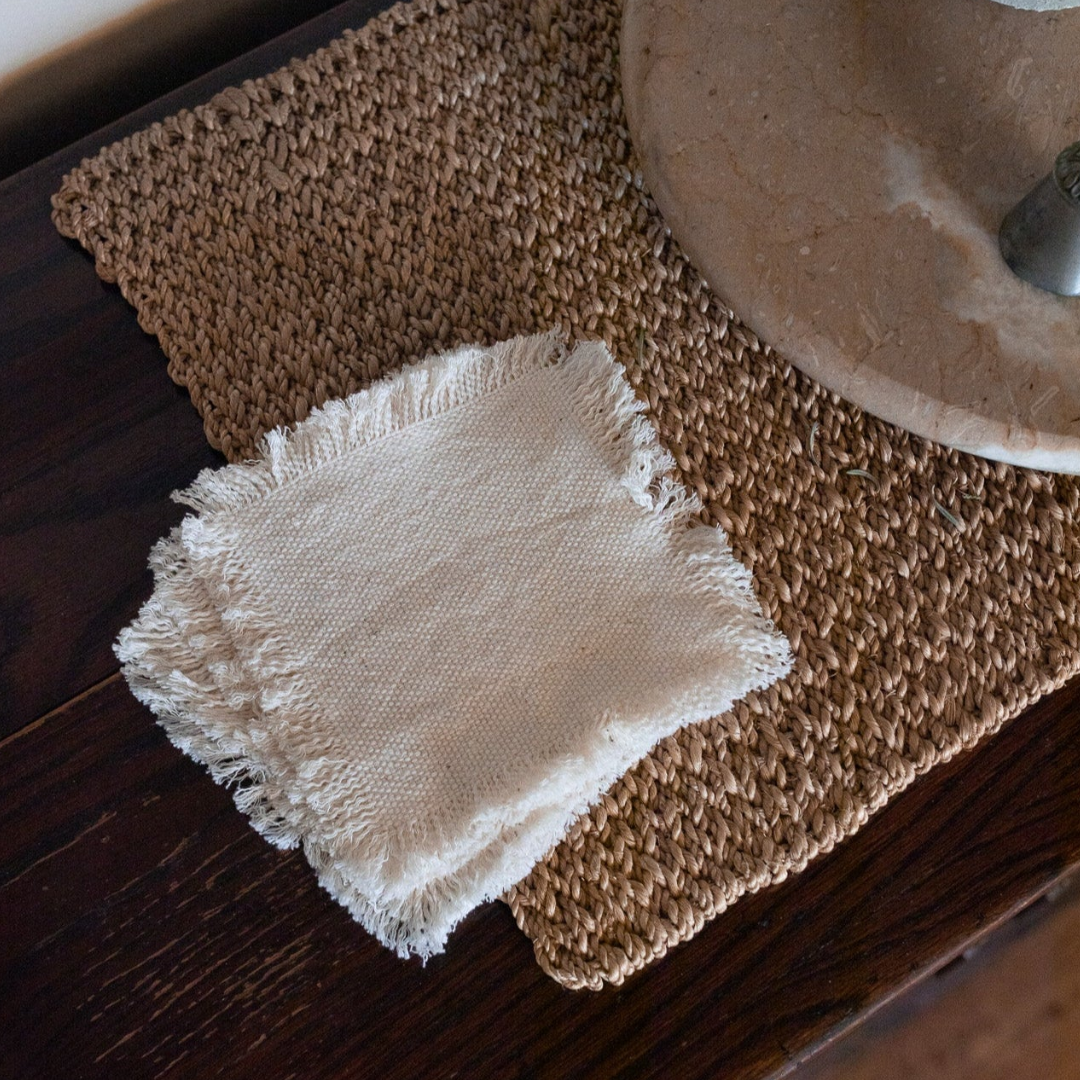 This set of four 100% cotton coasters are hand-woven with undyed yarn that has been washed and pre-shrunk. Each coaster measures 5” x 5” and has a beautifully woven texture that makes any experience with a cocktail or wine glass even better.