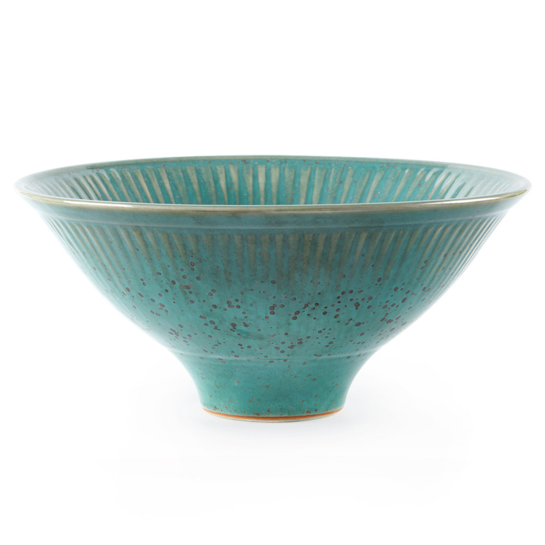 The Nyle Large Bowl is a beautifully crafted piece that balances artisanal detail with beautiful design. Its rounded form and wide, flared rim are elevated by shallow fluting, adding subtle texture and a sense of movement. Finished in a richly mottled turquoise glaze, each bowl is uniquely patterned through a reactive glazing process—making every piece one of a kind. The vibrant, organic tones create a striking focal point on a dining table, console, or shelf. Style it solo or pair it with our Sandor Vase and Olympia Vases for a thoughtfully layered and collected aesthetic.