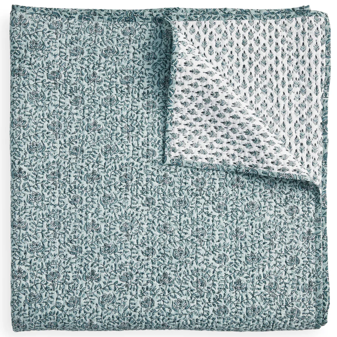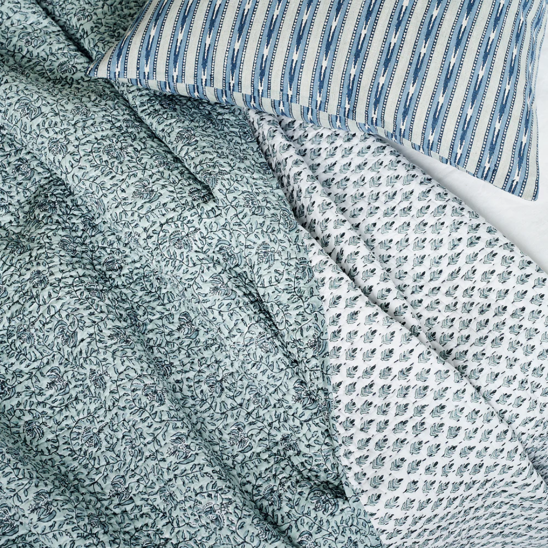 This sumptuous quilt features a divine trio of blue and green tones printed in our floral designs, Ubud and Sula. This quilt has been hand block printed and hand stitched by talented artisans in India.
